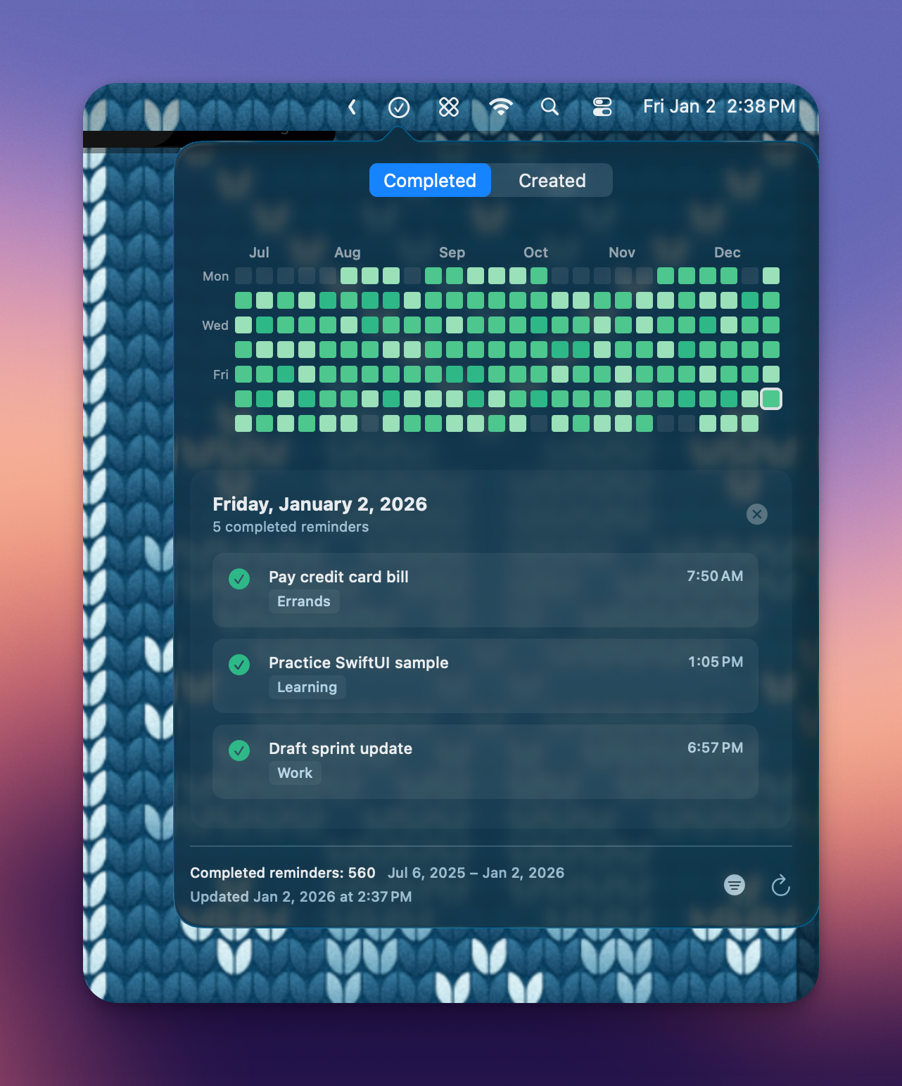 WIP. Github Heatmap meet Apple Reminder on your Menu Bar with Widgets.